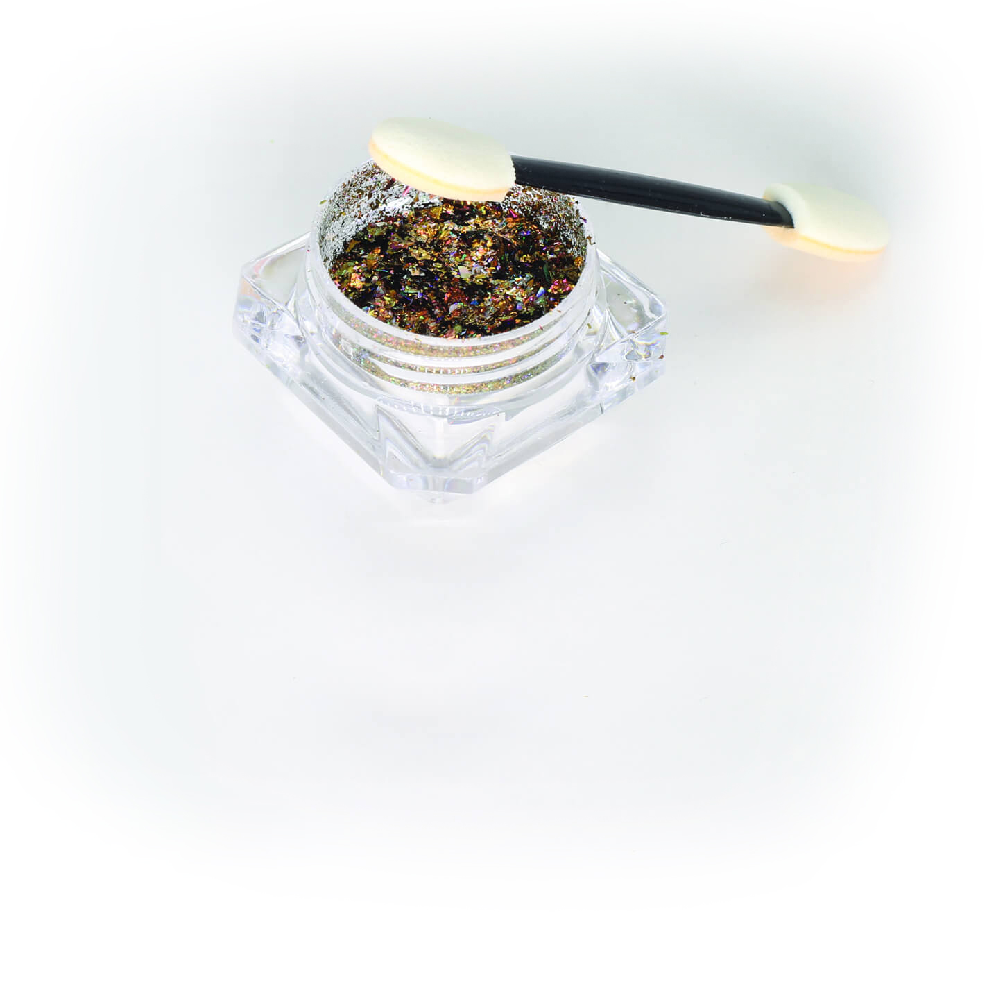 The powder starlight chameleon powder has shimmering particles that create a festive effect. "Global Fashion has introduced 12 different shades of powder starlight chameleon, which are applied on a black backing.