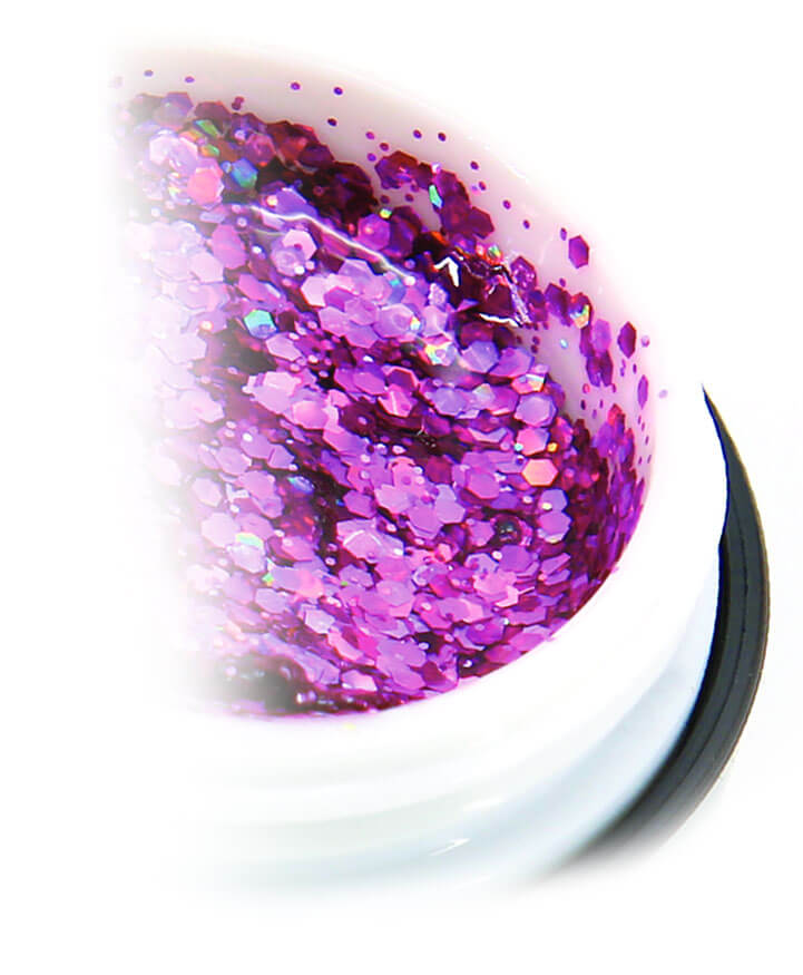 Glitter Gel "Global Fashion" consists of shiny hexagons. Glitter gel is often used to create stretch marks. Depending on the angle of illumination, the sequins in the gel sparkle with different iridescences.